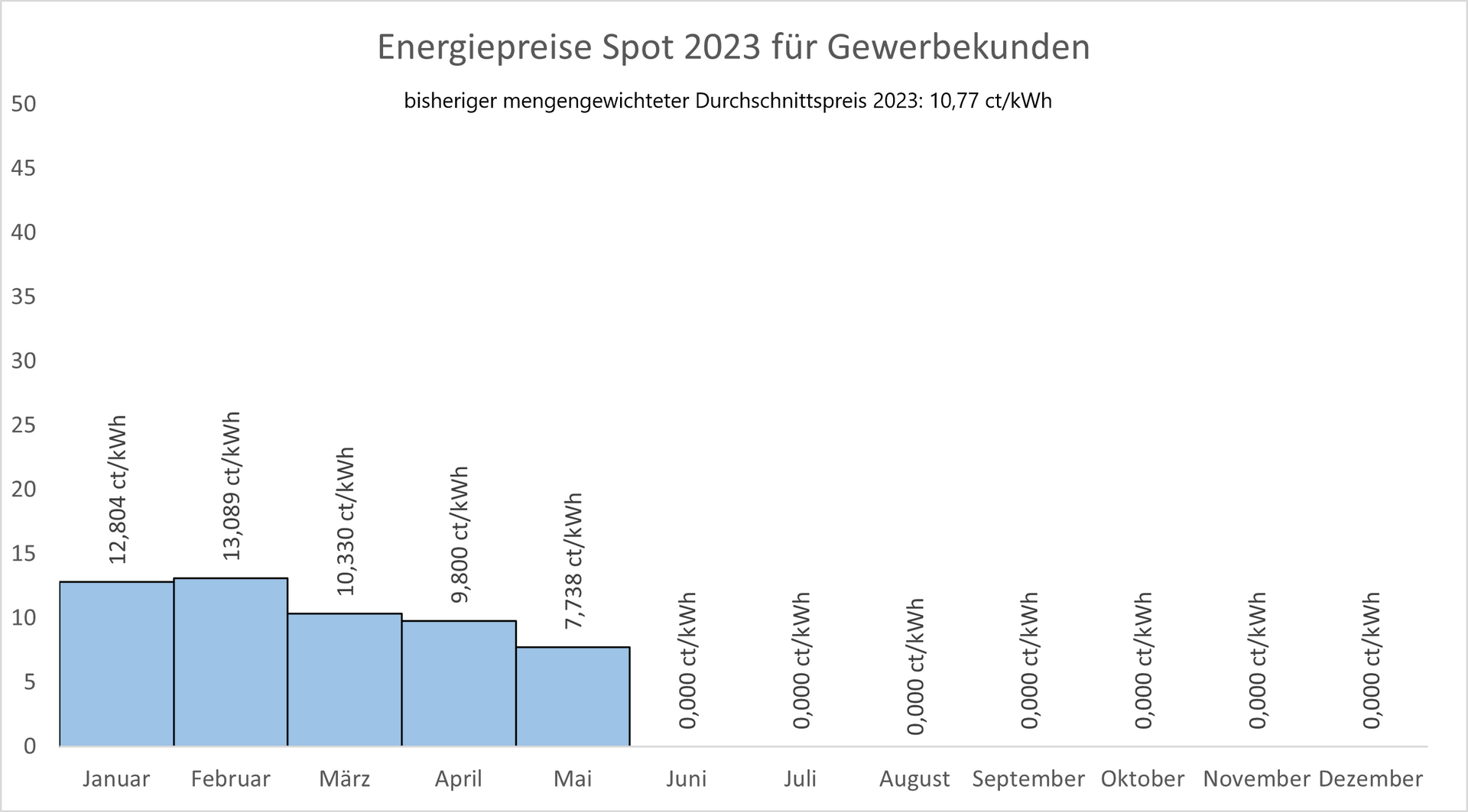 Below we present the current development of energy prices for the year 2023 based on the EPEX spot prices for customers who are supplied in the standard commercial load profile: